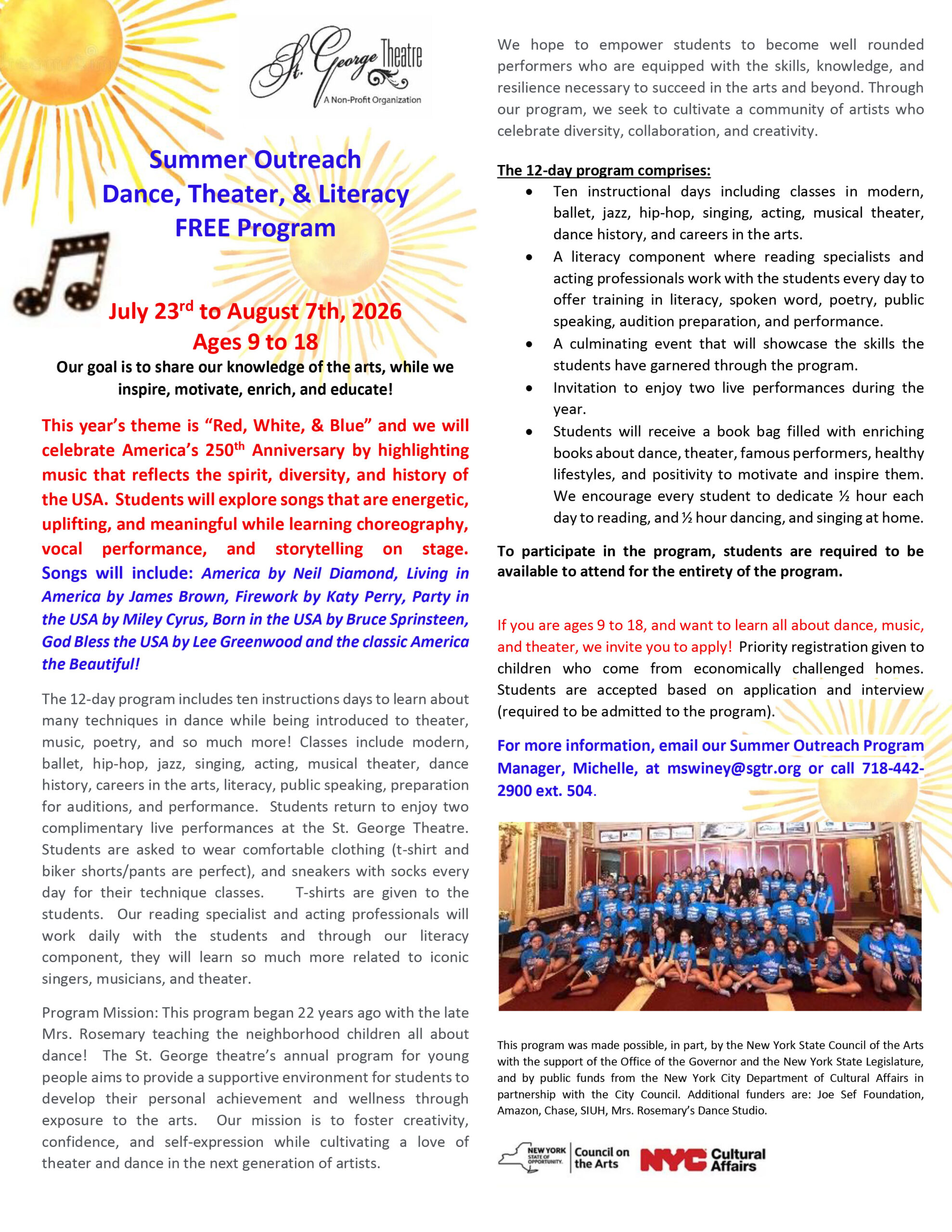 In Summer 2024, the St. George Theatre hosted its annual Summer Educational Dance, Theater, and Literacy Outreach Program for 65 students ages 9-18. This year, the theme of the program was “Legendary Jazz Artists”, which included the choreography and lyrics from Louis Armstrong, Duke Ellington, Ella Fitzgerald, Billie Holiday, Nat King Cole and “All That Jazz”!