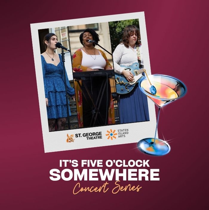 St. George Theatre and Staten Island Arts proudly present the It’s Five O’Clock Somewhere Concert Series. Enjoy a FREE intimate performance in the Honorable James P. Molinaro Lobby, complete with a cash bar featuring signature cocktails, refreshing mocktails, and light concessions. Seating is limited to 40 guests, creating a close-up, one‑of‑a‑kind experience. Performances will be streamed live on SGT FacebookSI Live, and Community Media of Staten Island Cable.